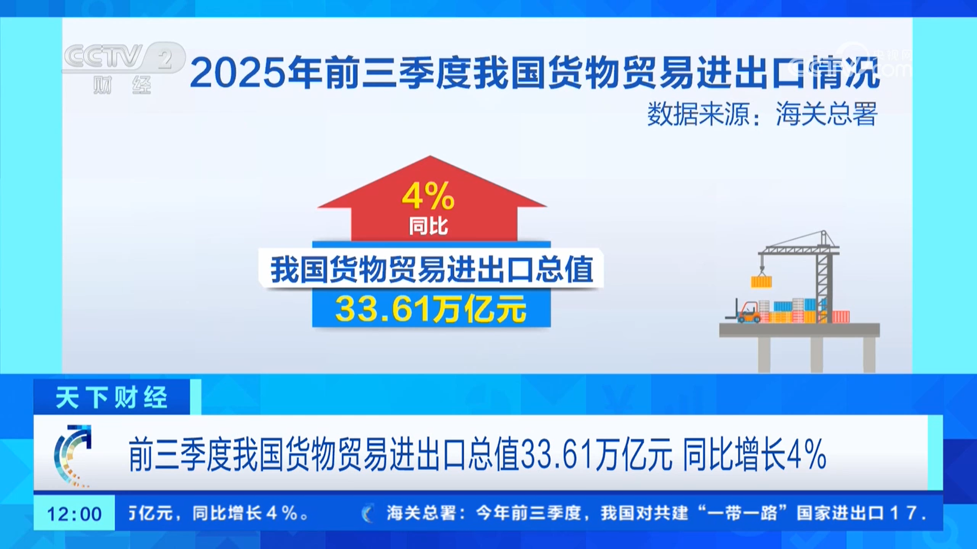 据海关计算,本年前三季度,我国货物贸易进出口总值33.61万亿元,同比添加4%。其间,出口19.95万亿元,同比添加7.1%;进口13.66万亿元,同比下降0.2%。
